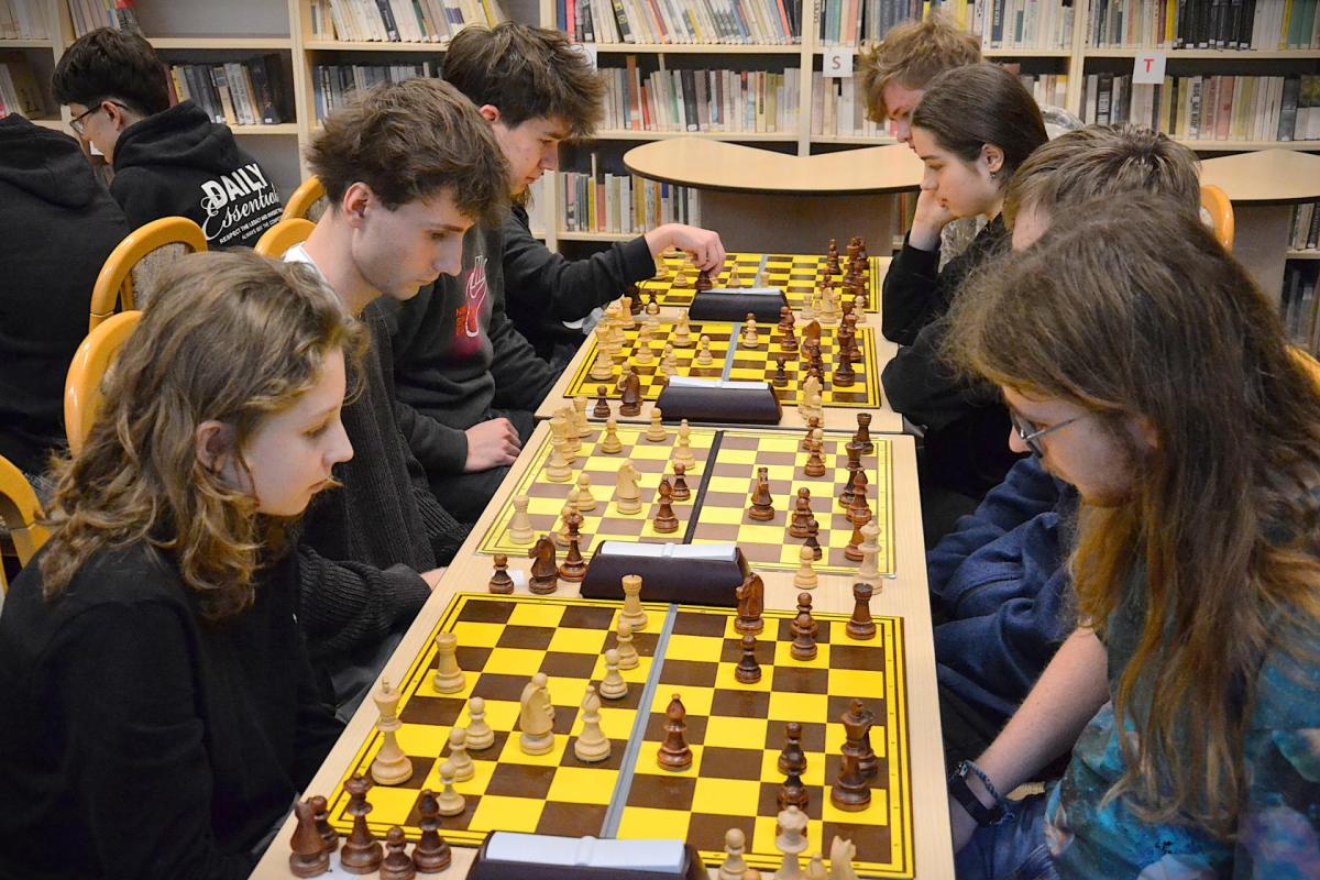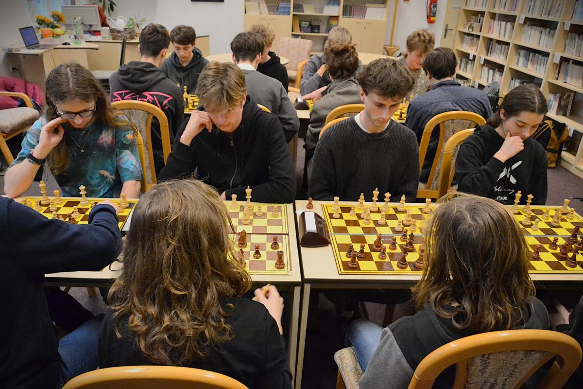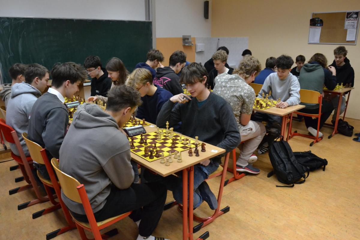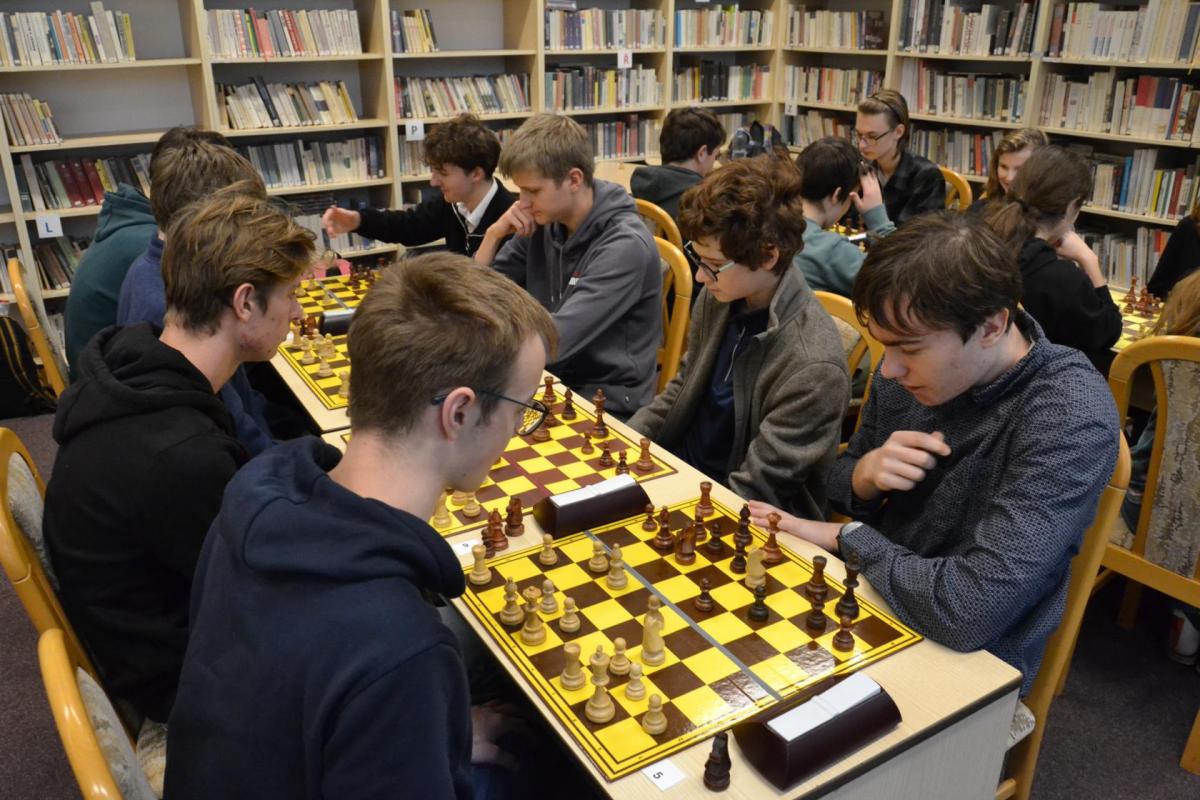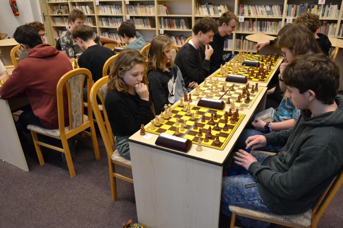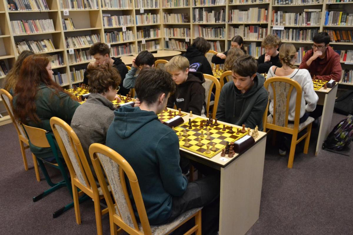 V úterý 16. 12. 2025 se sešlo v knihovně a blízkých učebnách hned 63 hráčů, což je stejně, jako při rekordní účasti v r. 2015. Hrálo se 9 kol, tempo 10 minut na partii + 2 sekundy za tah, to je dost rychlé.