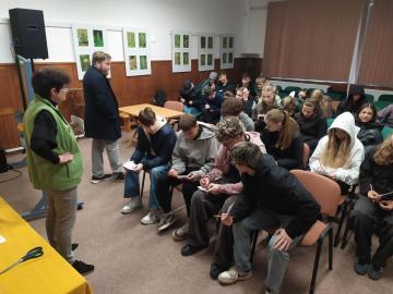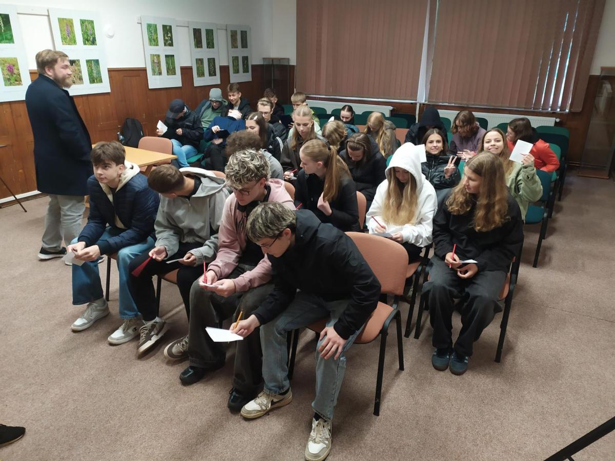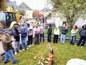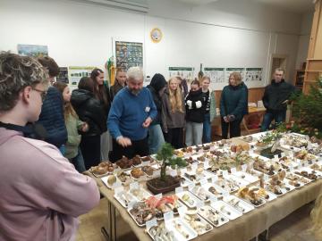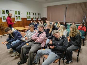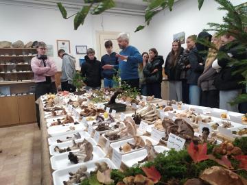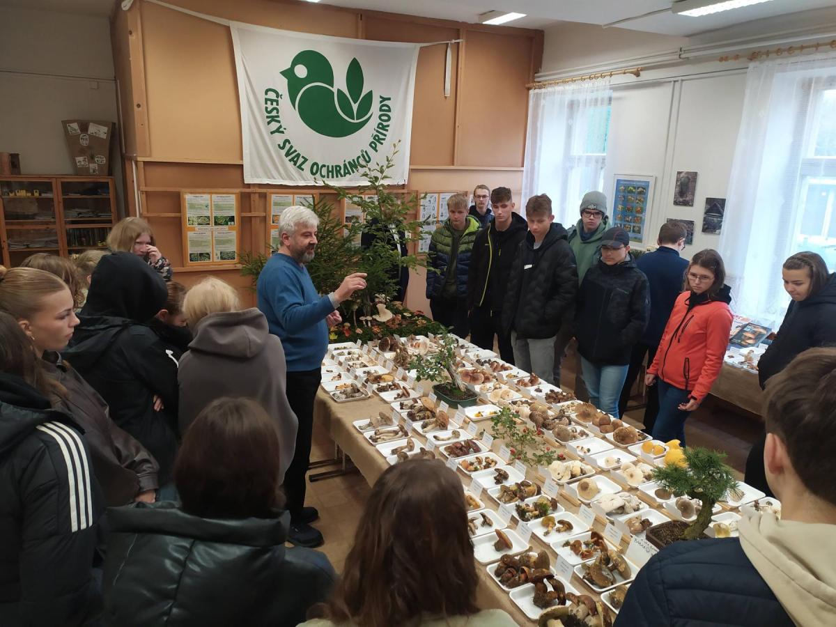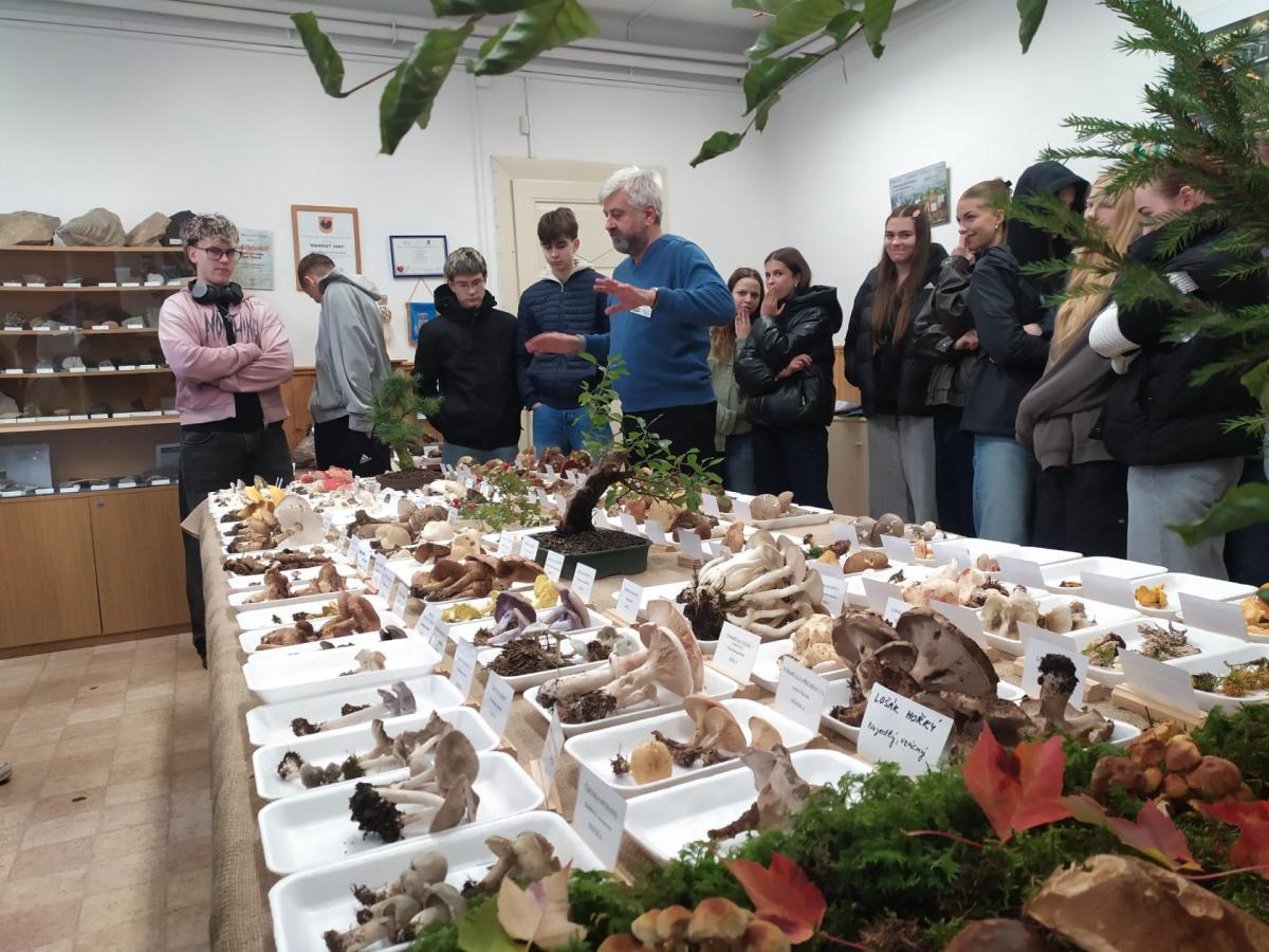 Sexta se na výstavu vyrazila podívat minulý pátek (10. 10. 2025) a myslím si, že si každý účastník mohl z výstavy odvézt nějaký hezký zážitek. I přes nepřízeň počasí se organizátorům opět podařilo za pár dní nasbírat a popsat výjimečné množství různých druhů hub (letos okolo 250). Kromě toho, že jsme si jejich úlovky mohli důkladně prostudovat, nebyli jsme ochuzeni ani o zasvěcený výklad hlavního třebovského mykologa p. Mičky. V předzahrádce třebovského ekocentra jsme pak s p. Grundem diskutovali na téma správný postup při sběru hub a chování houbaře v lese. Ve velké posluchárně si žáci potrápili hlavy při houbařském testíku či malém houbařském kvízu. Za 3 vyučovací hodiny docela dost akce:-)