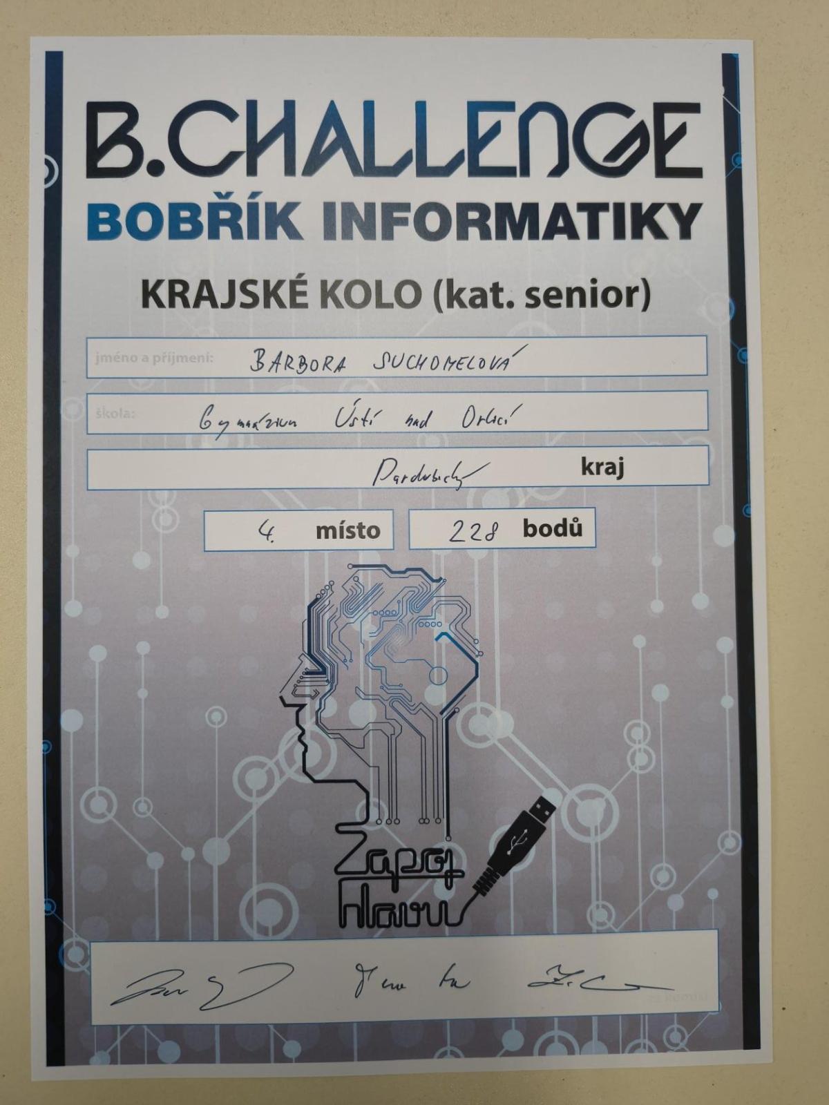 Našim studentům a studentce se velice dařilo. V konkurenci studentů ze škol se zaměřením na informatiku více než obstáli. Soutěžící z Pardubického kraje se ve všech ukazatelích umístili v celkovém srovnání do 3. místa, tedy uspět právě v Litomyšli bylo opravdu těžké.