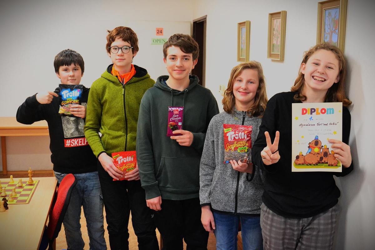 Hned tři naši hráči byli z primy (Alexandra Dudlová, Antonín Palán, Matěj Peterka), na první šachovnici je vedl sekundán Marian Pokorný, nejzkušenějším členem týmu byl kvartán Jan Skubi. Od začátku nebylo pochybností o tom, že si jdeme pro vítězství, vyhráli jsme všech 6 zápasů s celkovým skóre 22:2 a z 1. místa postupujeme do krajského kola. Tenhle tým může v dalších letech mířit vysoko.