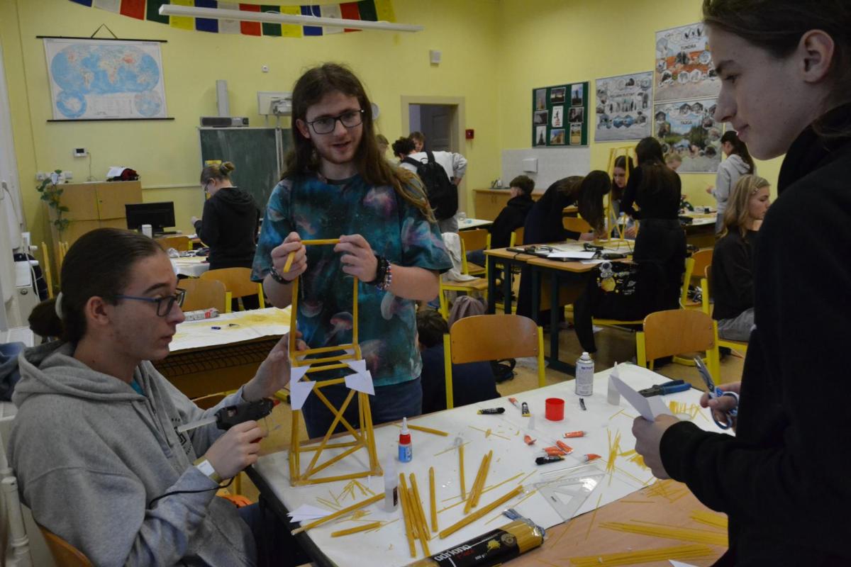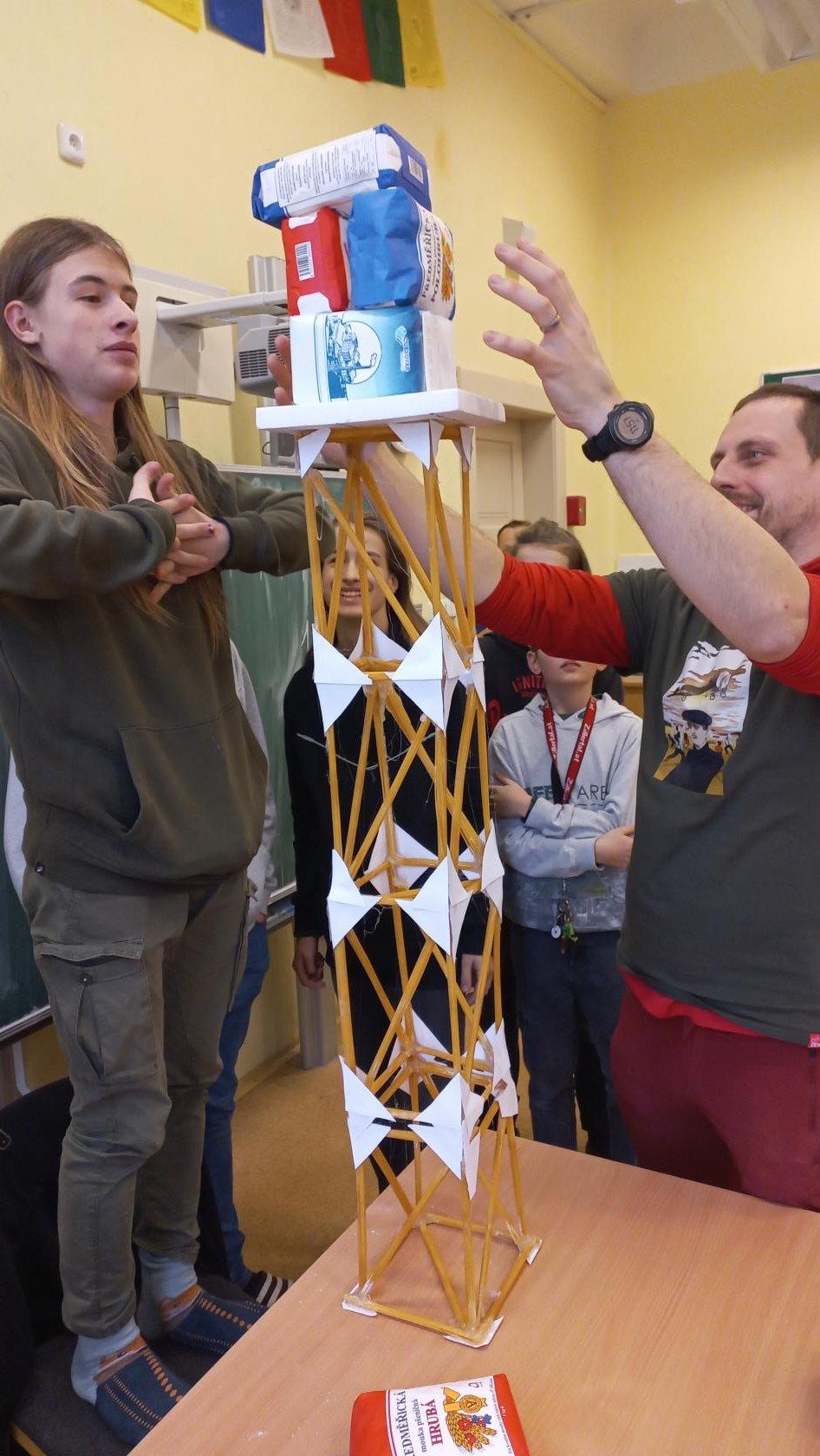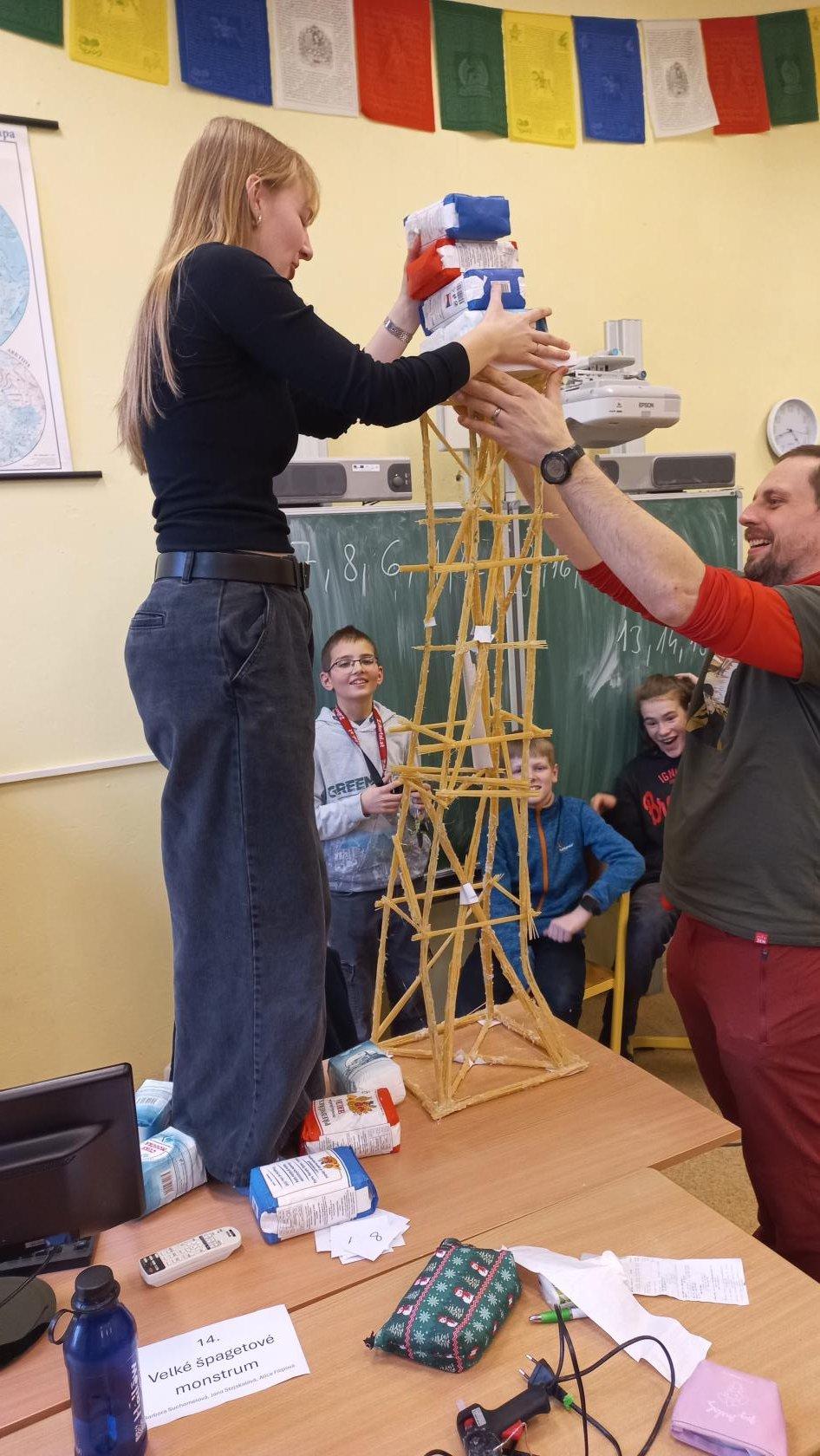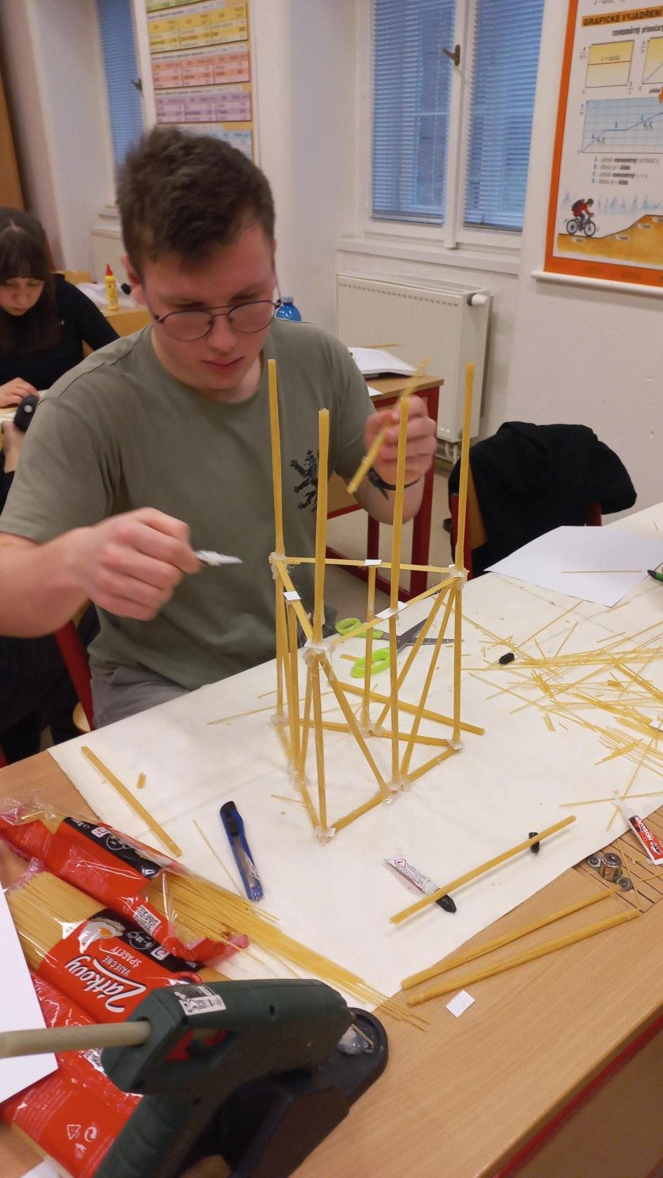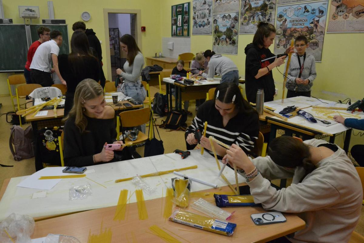 Základním úkolem letošního ročníku konstruktérské soutěže bylo z maximálně 3 běžných balíčků špaget postavit co nejvyšší věž, která unese 5 kg. Z 15 přihlášených týmů se nosnost podařilo splnit 14. Tým „Pasťáci“ dívek z maturitní 8. B mířil s výškou do rekordních 128 cm, bohužel však při zatížení 4,5 kg se jejich konstrukce začala hroutit. Děvčata však zaslouží však cenu za odvahu, že mířila opravdu vysoko.