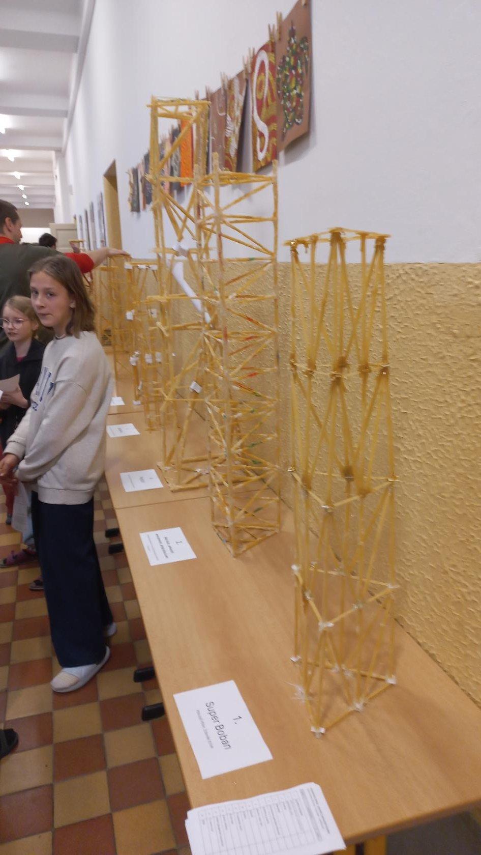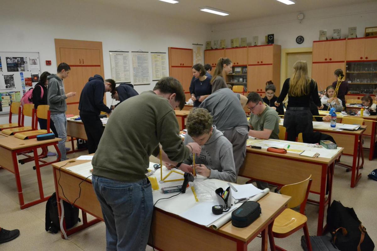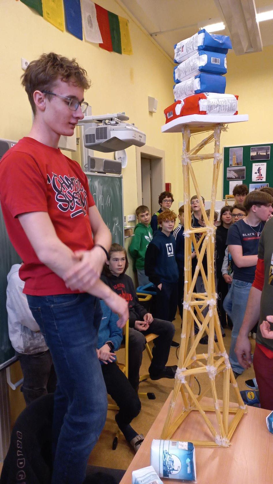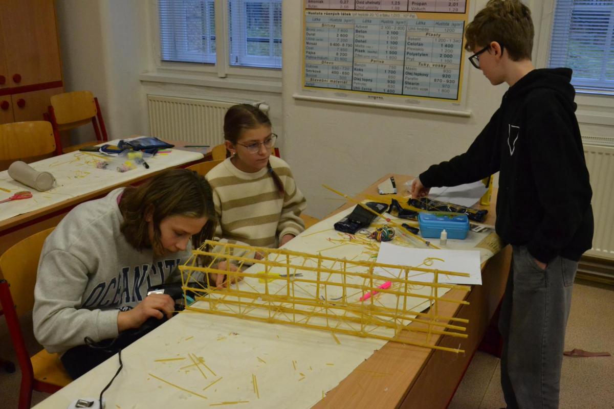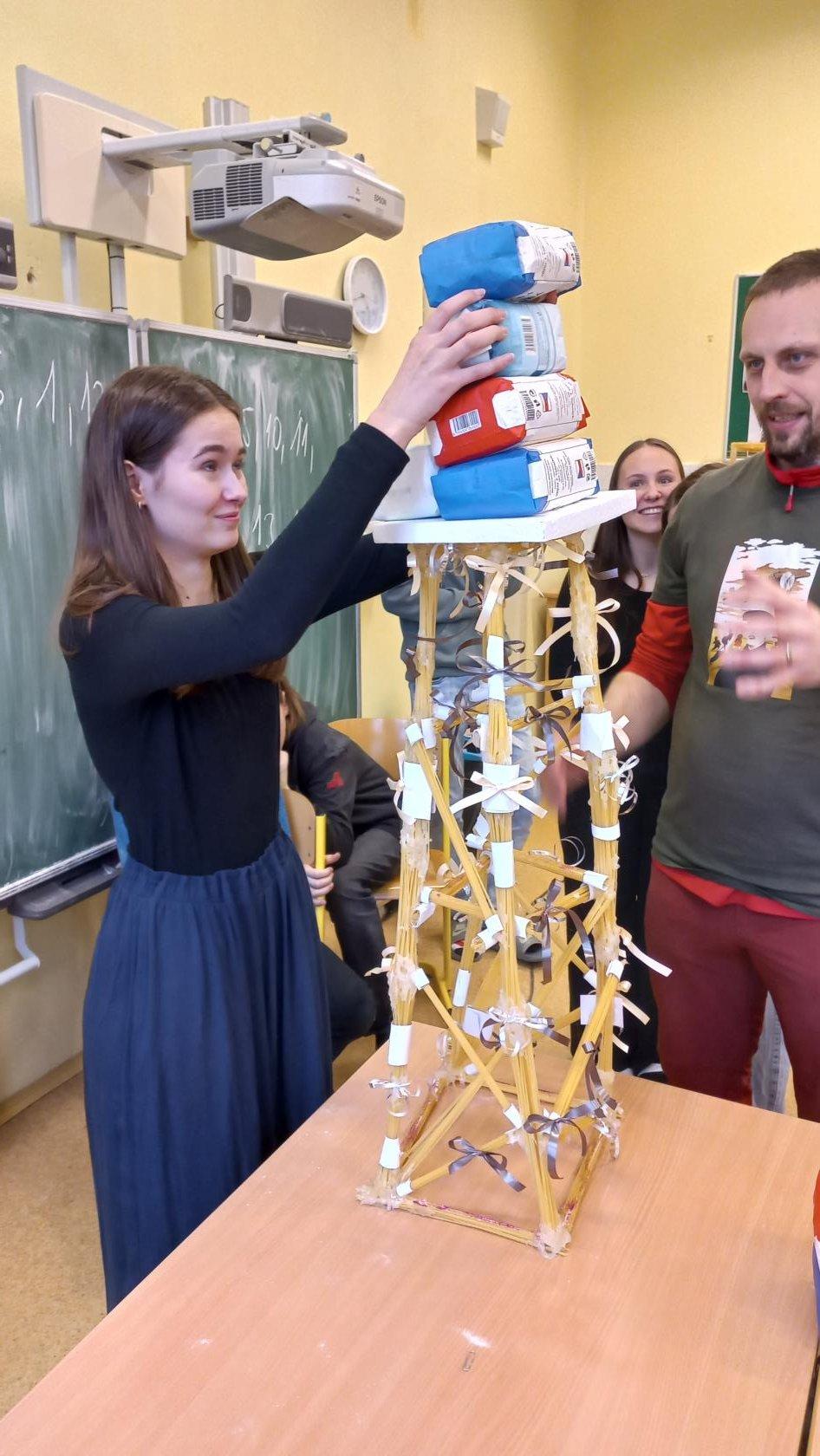 Základním úkolem letošního ročníku konstruktérské soutěže bylo z maximálně 3 běžných balíčků špaget postavit co nejvyšší věž, která unese 5 kg. Z 15 přihlášených týmů se nosnost podařilo splnit 14. Tým „Pasťáci“ dívek z maturitní 8. B mířil s výškou do rekordních 128 cm, bohužel však při zatížení 4,5 kg se jejich konstrukce začala hroutit. Děvčata však zaslouží však cenu za odvahu, že mířila opravdu vysoko.