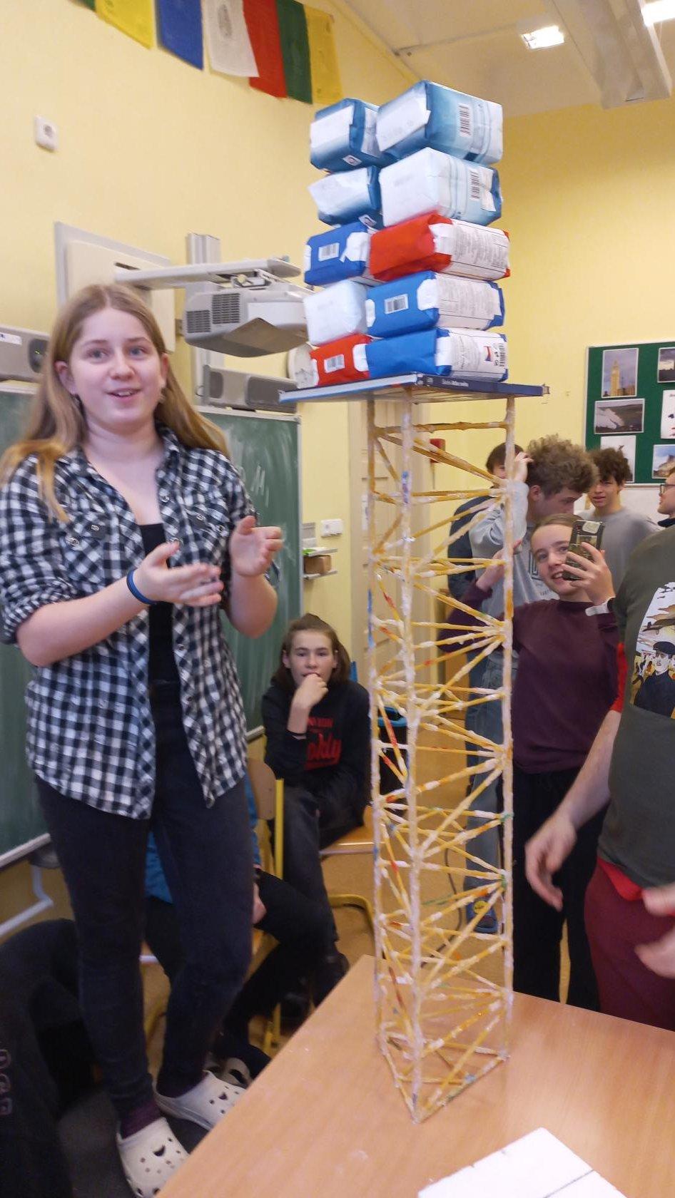 I přes dílčí penalizaci se týmu „Trojúhelník smrti“ ve složení J. Hruška, J. Ďopan, K. Vacek ze 2. A podařilo s uznanou výškou 109,5 cm těsně (o pouhý půl centimetru) porazit dívky „To jsme my!“ ze 6. B (A. Maličká, V. Hrabovská, T. Lukešová). Třetí místo v hlavní soutěži za věž vysokou 106,5 cm získal chlapecký „Dlouho–vlas–tým“.